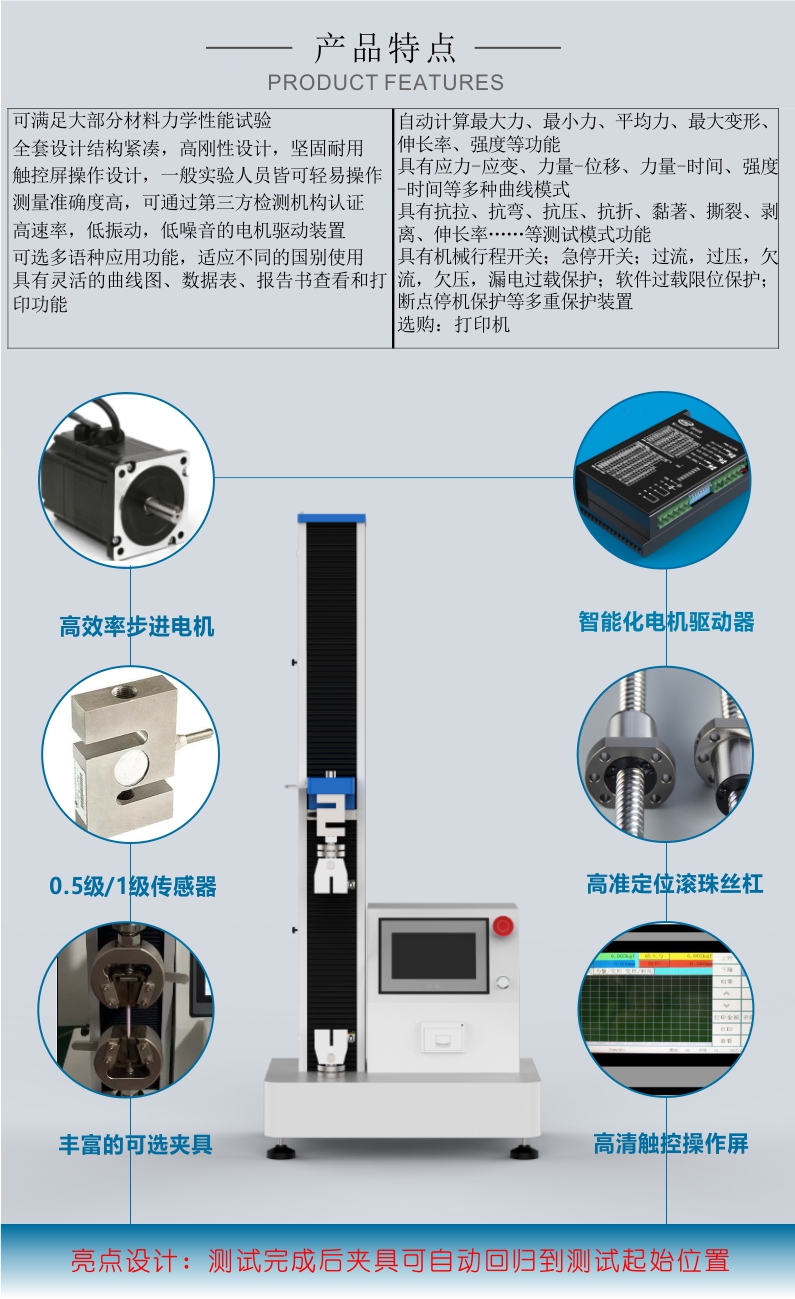 YTN-D系列單柱拉力試驗機采用單柱結(jié)構(gòu),結(jié)構(gòu)牢固,操作方便,維護簡單。設(shè)備配備了多重保護裝置,包括機械行程開關(guān)、急停開關(guān)、過流、過壓、欠流、欠壓、漏電過載保護等,確保設(shè)備在運行過程中的安全性。此外,設(shè)備還具有測試完成后自動返回至測試起始位置的自動歸位功能,進一步提升了操作的便捷性。