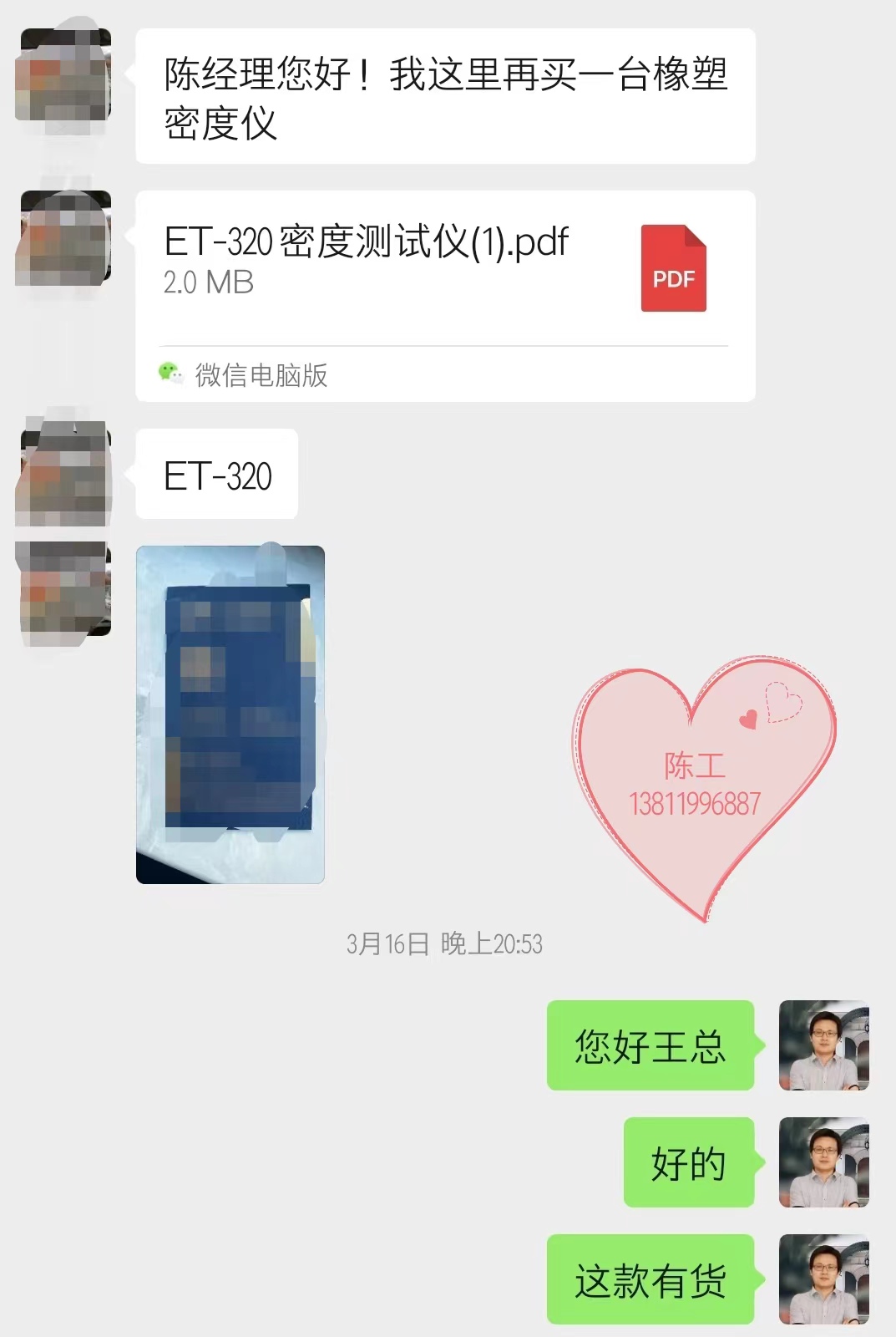 塑料密度的測(cè)定方法,塑料行業(yè)常用的密度儀器ET-320,也是我們的塑料行業(yè)在用過(guò)這個(gè)型號(hào)的密度計(jì)后,建分廠復(fù)購(gòu)和轉(zhuǎn)介紹多的一個(gè)型號(hào),像這位王總時(shí)隔2年再拿采購(gòu)ET-320密度測(cè)試儀。