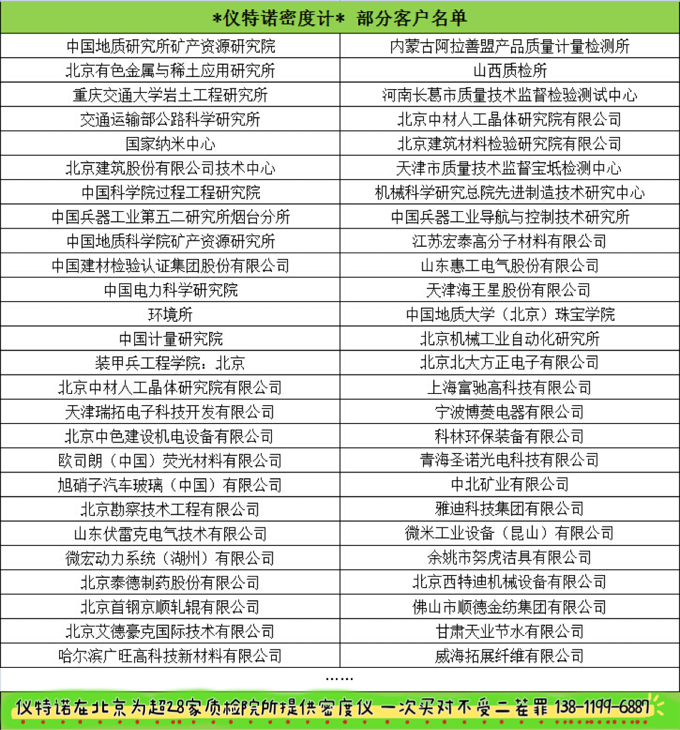 源頭廠家,實力在我。儀特諾在北京為超28家質(zhì)檢院所、985/211高校提供密度測試儀器,一輩子的事業(yè),持續(xù)做好產(chǎn)品質(zhì)量與服務(wù),我們一直在路上...歡迎隨時聯(lián)系,把你的需求告訴儀特諾,為你提供專業(yè)的密度測量解決方案。